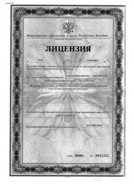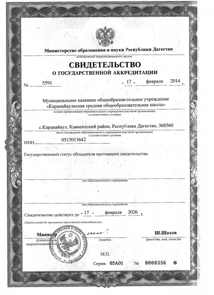 | Адрес местонахождения образовательной организации* | 368563 Республика Дагестан, Каякентский район с. Каранайаул, ул.Родниковая №26 |